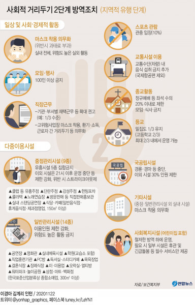 | 열람중 | 24일부터 수도권 거리두기2단계 시행한대요. (2) | 2020-11-22 | 4,488 |